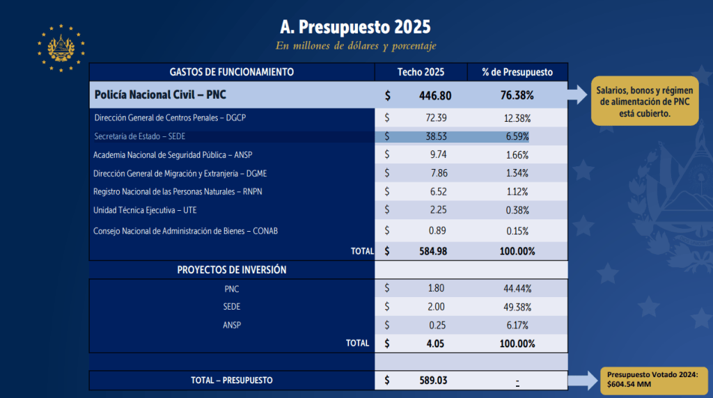 Policía Nacional Civil – PNC $ 446.80 millones, es decir un 76.38% del total del presupuesto y la Dirección General de Centros Penales – DGCP $ 72.39 millones, lo que significa un 12.38% del total del presupuesto para 2025.